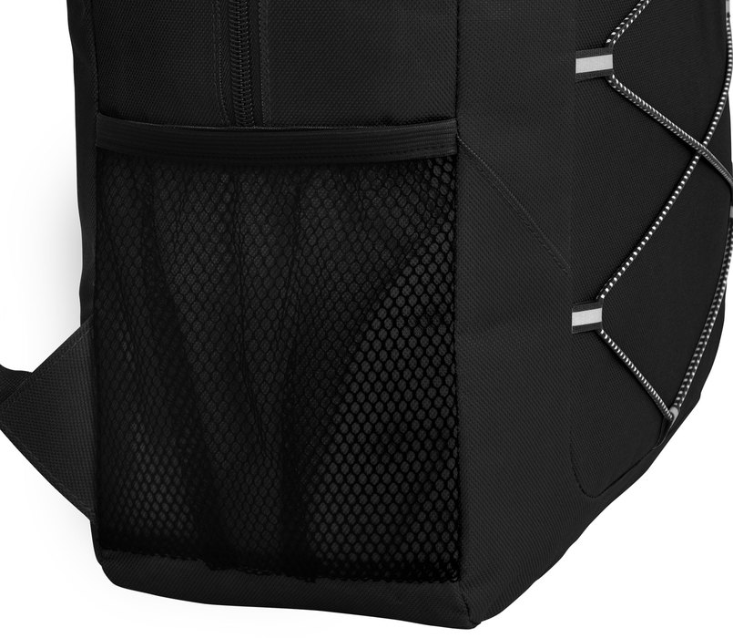 Mochila outdoor. Compartimento principal con doble cierre. Bolsillo frontal con cierre, cordón elástico cruzado ajustable y un bolsillo de red lateral para transportar botellas. Detalles reflectivos. Cierres metálicos con tiradores de goma. Correas regulables y espalda acolchadas.